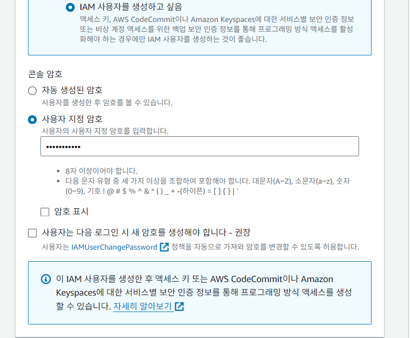 IAM 사용자를 클릭해주고, 지정 암호를 만들어주자