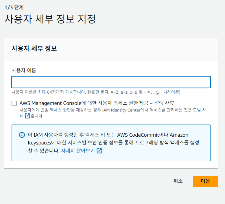 이름과 비밀번호를 입력해주면 우리가 생성한 IAM 유저로 로그인 할 수 있다.