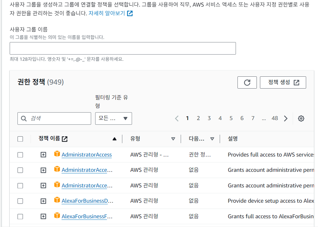 이후 그룹 이름과 해당 그룹에 부여해줄 권한 목록을 아래에서 선택한 후 그룹에 사용자를 할당하자.