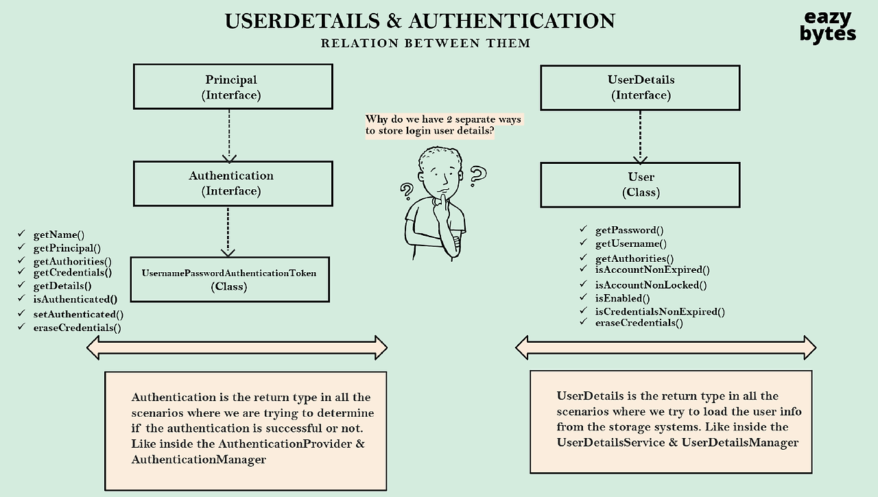 - UserDetials 와 User 클래스는 데이터베이스나 메모리등 저장 시스템에서 유저의 정보를 로드할 때 사용된다.