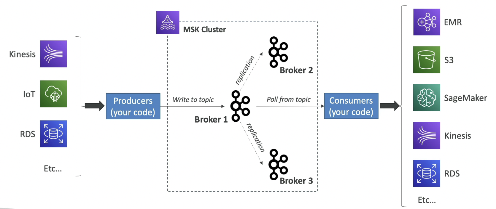 - 키네시스는 샤드라는 개념을 사용하고, MSK는 파티션과 토픽이라는 개념을 사용한다.