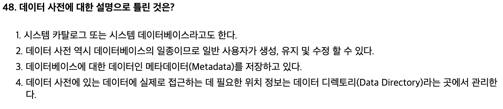 <문제 해설> 데이터 사전(Data Dictionary) - 시스템 자신이 필요로 하는 여러 가지 객체(기본 테이블, 뷰, 인덱스, 데이터베이스, 패키지, 접근 권한 등)에 관한 정보를 포함하고 있는 시스템 데이터베이스이다. - 시스템 카탈로그(System Catalog), 메타 데이터(Meta Data)라고도 한다. - 시스템 카탈로그 자체도 시스템 테이블로 구성되어 있어 SQL 문을 이용하여 내용 검색이 가능하다. - 사용자가 시스템 카탈로그를 직접 갱신할 수 없다. - SQL 문으로 여러 가지 객체에 변화를 주면 시스템이 자동으로 갱신한다. [해설작성자 : 두목넷] |