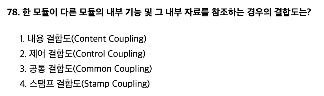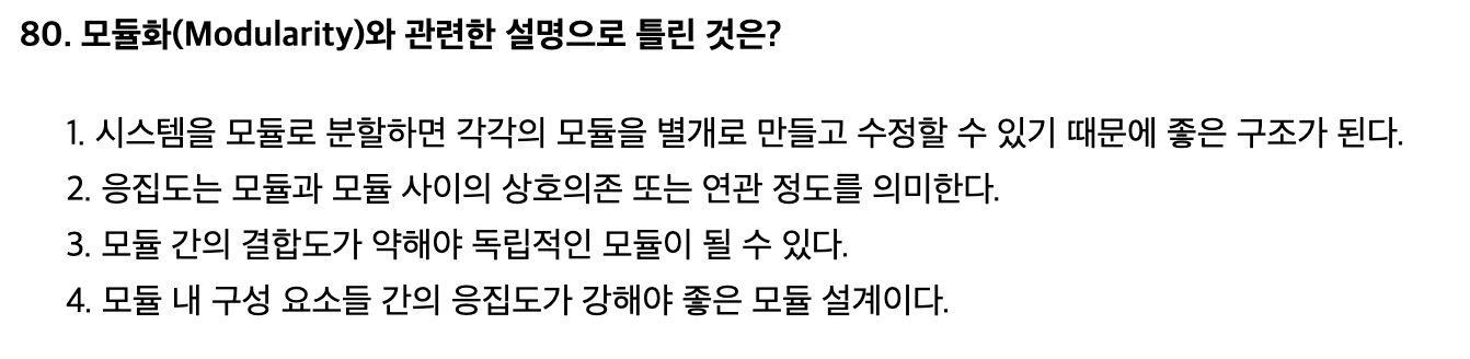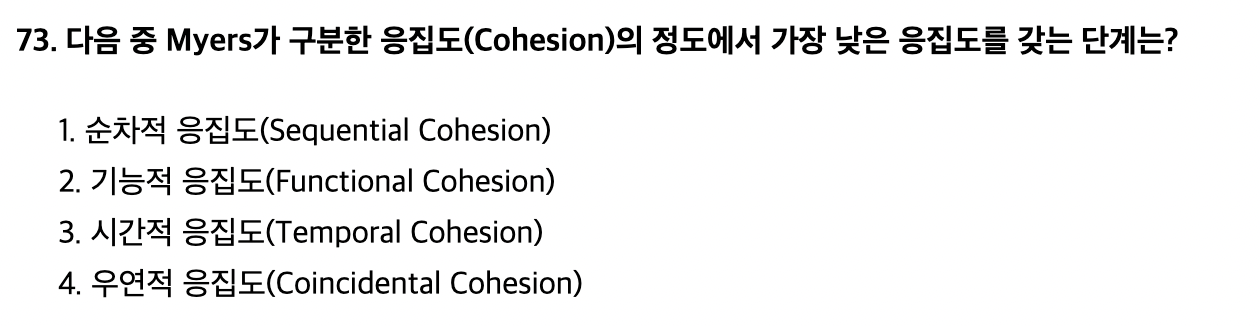 - (강함) 기능적 응집도 > 순차적 응집도 > 교환적 응집도 > 절차적 응집도 > 시간적 응집도 > 논리적 응집도 > 우연적 응집도 (약함)