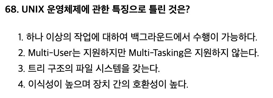 <문제 해설> UNIX 운영체제 주로 서버용 컴퓨터에서 사용됨 time sharing system을 위해 설계된 대화식 운영체제 c언어로 작성되어 이식성 높고, 장치간 호환성 높다. Multi user, Multi tasking 모두 지원. 트리 구조의 파일시스템 [해설작성자 : 합격하자] |
