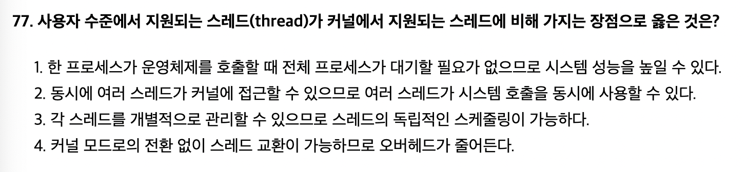 - 장점: 스레드 전환이 빠르고, 커널 모드로의 전환 없이 스레드를 전환할 수 있어 오버헤드가 적다.