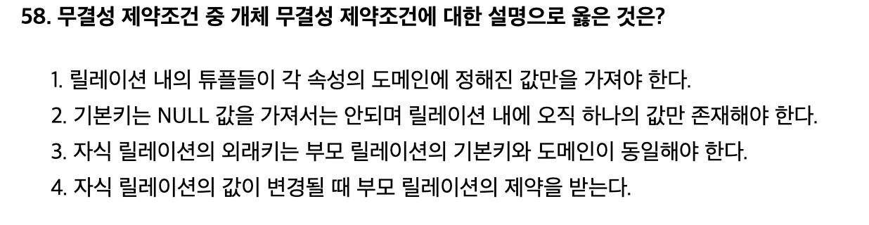 1.개체 무결성 : 각 릴레이션의 기본키를 구성하는 속성은 널(NULL) 값이나 중복된 값을 가질 수 없습니다.