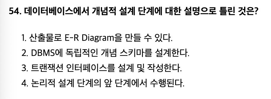 <문제 해설> 데이터베이스 설계단계에서의 트랜잭션 설계단계 - 개념설계 : 트랜잭션 모델링 - 논리설계 : 트랜잭션 인터페이스 설계 - 물리설계 : 트랜잭션 세부설계 [해설작성자 : 두목넷] 개념적 설계 : 트랜잭션 모델링/ 독립적인 개념 스키마 모델링/ 개념스키마 설계/ E-R 다이어그램 논리적 설계 : 트랜잭션 인터페이스 설계/ DBMS에 맞는 논리스키마 설계/ 테이블 설계/ 논리적 매핑/ 스키마 평가 및 정제 물리적 설계 : 레코드 집중의 분석,설계/ 저장레코드 양식 설계 / 저장 구조 및 액세스 경로 설정 [해설작성자 : 브라더진 내일 시험본다..] |