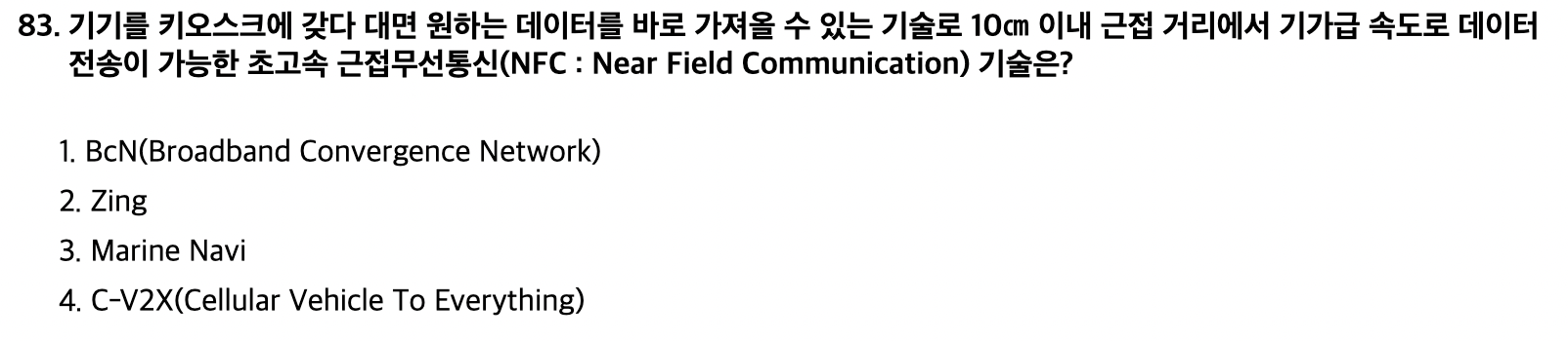 <문제 해설> 근거리로 가까이 가면 지이이이잉 하고 소리가 난다고 외우세요. [해설작성자 : 연상암기황제] 1번 BcN은 음성·데이터·유무선 등 통신·방송·인터넷이 융합된 품질 보장형 광대역 멀티미디어 서비스를 공간에 제한없이 실시간으로 이용할 수 있는 차세대 네트워크 환경이다. 3번 Marine Navi는 소형 선박에 설치된 GPS 기반 선박자동 식별장치(AIS: Automatic Identification System)를 기본으로 주변 선박의 이동 속도와 위치를 파악한다. 4번 엘티이(LTE), 5G와 같은 셀룰러 이동통신망을 통해 차량이 다른 차량이나 교통 인프라, 보행자, 네트워크 등과 정보를 서로 주고받는 차량 통신 기술. [해설작성자 : 곰팡이친구먼지] |