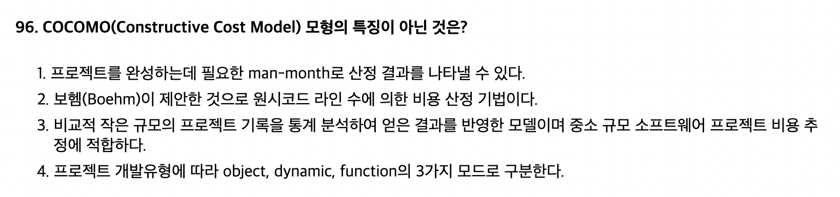 개발유형에 따라 조직형(Organic), 반분리형(Semi-Detached), 내장형(Embedded)으로 구분한다.