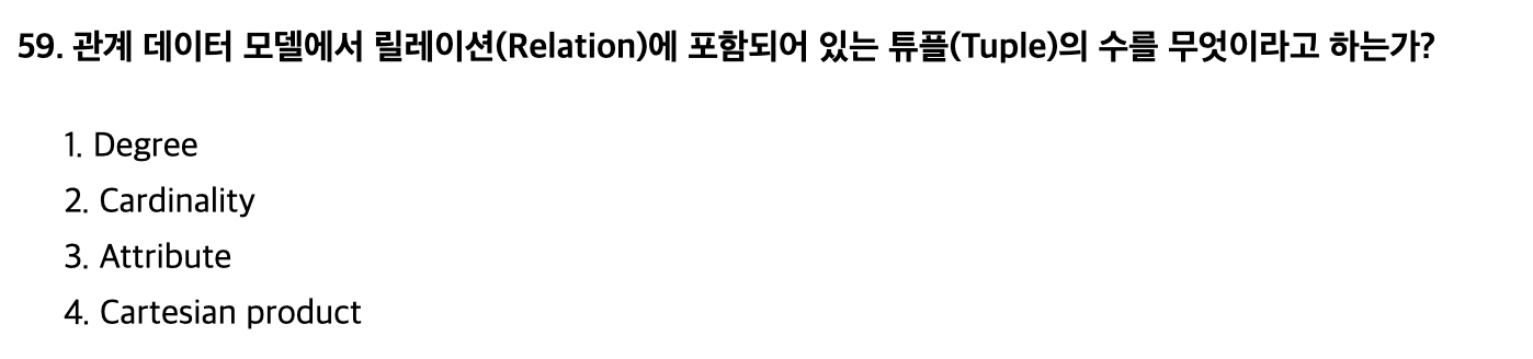<문제 해설> - 차수(Degree) : 속성의 수 - 카디널리티(Cardinality) : 튜플의 수 (기수) [해설작성자 : 두목넷] |