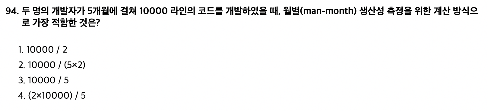 개발기간 측정 = 예측된 LOC(라인) / (투입인원 X 1인당 월평균 LOC)