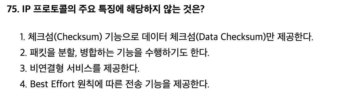 <문제 해설> Total Packet Length (16 bits): IP 헤더 및 데이터를 포함한 IP 패킷 전체 길이를 바이트 단위로 길이를 표시. (최대값은 65,535 = 2^16 - 1) [해설작성자 : 루니] |