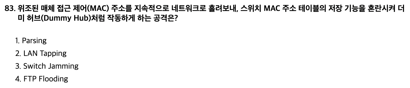 - 스위치의 기능이 방해 받아 정상 동작을 하지 못해 스위치가 더미 허브처럼 작동 하게 되는 것