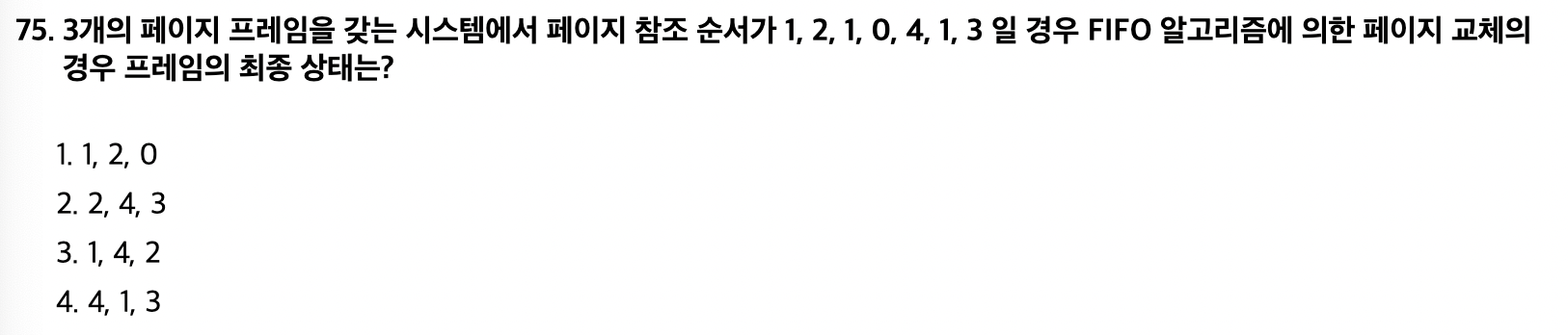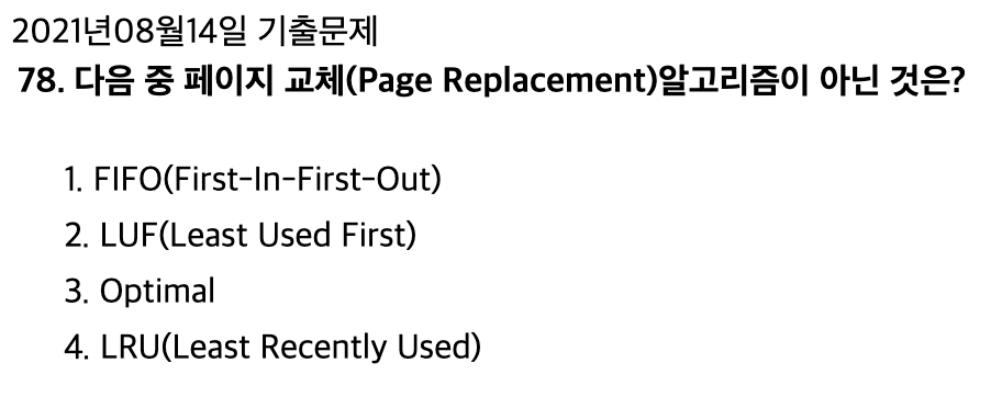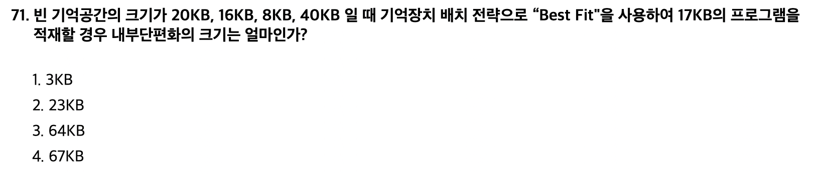 <문제 해설> 문제에서 Best Fit을 물을 시 내부단편화가 제일 작은 보기를 찾으면 됨 1) 20KB - 17KB = 3KB 2) 16KB - 17KB = 불가 3) 8KB - 17KB = 불가 4) 40KB - 17KB = 23KB 따라서 1번이 정답 [해설작성자 : 단기합격은 유튜브 윤파고] - First Fit: 들어갈 수 있는 첫 번째 공간에 넣음 - Best Fit: 내부 단편화(자투리)가 가장 적게 남는 공간에 넣음 - Worst Fit: 가장 큰 공간에 넣음 [해설작성자 : 민트초코담금주] |