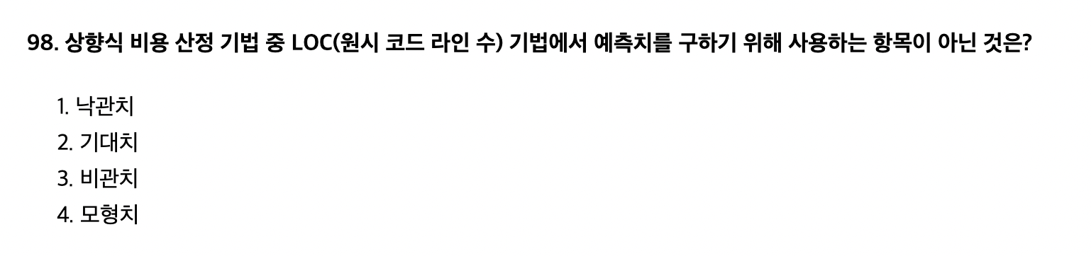 - 낙관치: 최선의 경우를 예상한 수치로, 개발이 순조롭게 진행될 때 필요한 코드 라인 수입니다.