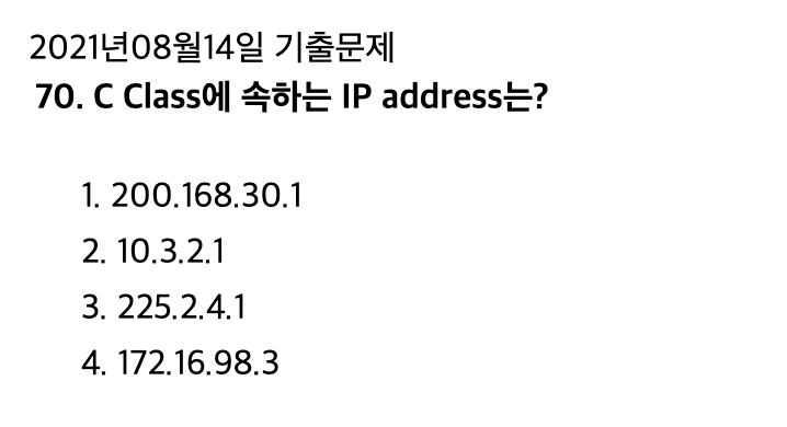 C class에 속하는 ip 주소 범위: 192.0.0.0 ~ 223.255.255.255