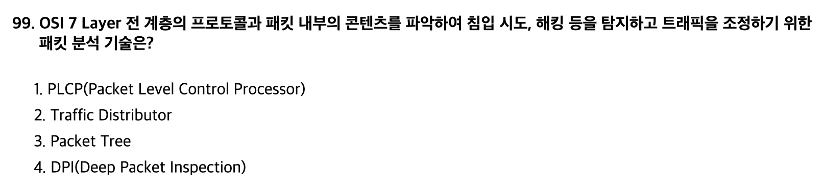 | <문제 해설> - PLCP(Physical Layer Convergence Procedure : 물리계층 수렴 처리) - 논리적인 802.11 MAC 부계층과 물리적인 특성을 연결하는 역할 - 802.11 MAC 부계층이 물리적 특성에 관계없이 동작하도록 함 - Traffic Distributor - 네트워크 통신 간에 트래픽을 분배해주는 솔루션 - DPI - 네트워크에서 전송되는 패킷의 헤더와 페이로드 내 정보를 분석하는 컨텐츠 내용 분석 기술 - 네트워크 보안, 관리, 컨텐츠 관리 등이 목적 *단어의 정의를 몰라도 하나씩 뜯어보면 Deep(내부) Packet Inspection(분석)으로 유추 가능 [해설작성자 : 강썬] |