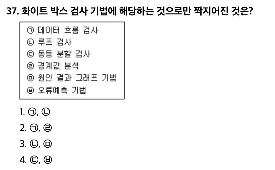 <문제 해설> 화이트박스 테스트의 종류 1. 기초경로 검사 2. 제어구조 검사 화이트박스 테스트 검증 기준 1. 문장 검증 기준 2. 분기 검증 기준 3. 조건 검증기준 4. 분기/조건 기준 블랙박스 테스트의 종류 1. 동치(동등)분할 검사 2. 경계값 분석 3. 원인-효과 검사 4. 오류 예측 검사 5. 비교검사 [해설작성자 : JYH] 화이트박스 테스트 종류 기초 경로 검사(Basic Path Testing) 조건 검사(Condition Testing) 루프 검사(Loop Testing) 데이터 흐름 검사(Data Flow Testing) [해설작성자 : User] |