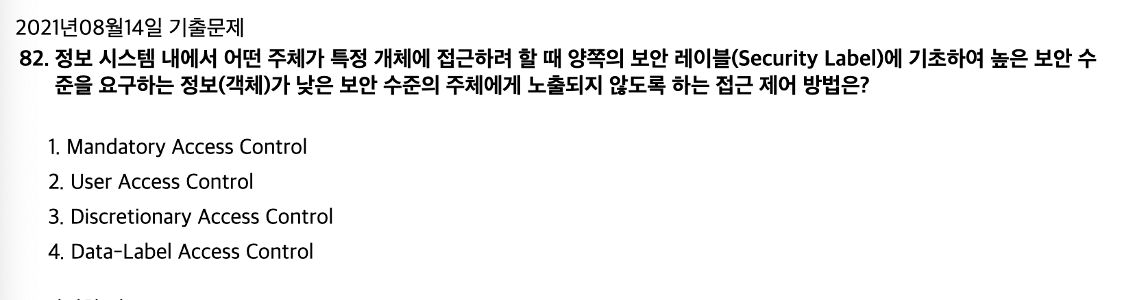 <문제 해설> 강제접근통제(Mandatory Access Control), 주체와 객체의 등급을 비교하여 접근 권한을 부여하는 방식 임의접근통제(Discretionary Access Control), 접근하는 사용자의 신원에 따라 접근 권한을 부여하는 방식 사용자계정컨트롤(User Access Control), 프로그램에서 관리자 수준의 권한이 필요한 작업을 수행할 때 사용자에게 알려서 제어할 수 있도록 돕는 기능 자료별 접근통제(Data-Label Access Control > Label-Based Access Control), 개별 행, 열에 대해 쓰기 권한, 읽기 권한을 가졌는지를 명확하게 결정하는 제어 방식 [해설작성자 : 월담] |