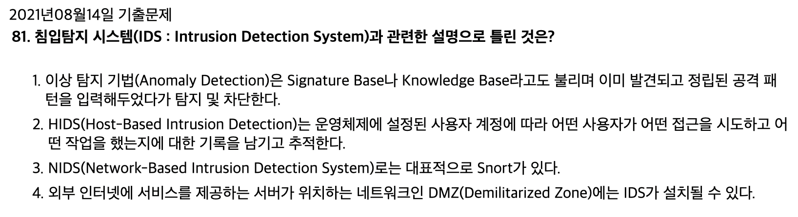 - 오용탐지 : 잘 알려진 시스템의 취약점을 공격하는 패턴의 침입을 탐지 (새로운 공격 패턴을 막기 어려움)