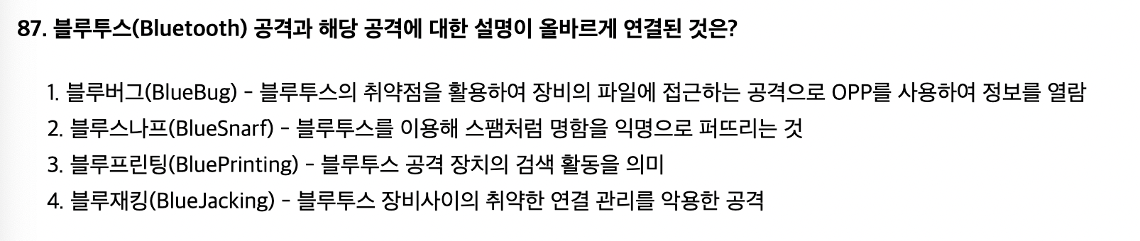 블루스나프(블루스나핑): 블루투스의 취약점을 활용하여 장비의 파일에 접근하는 공격으로 OPP를 사용하여 정보를 열람