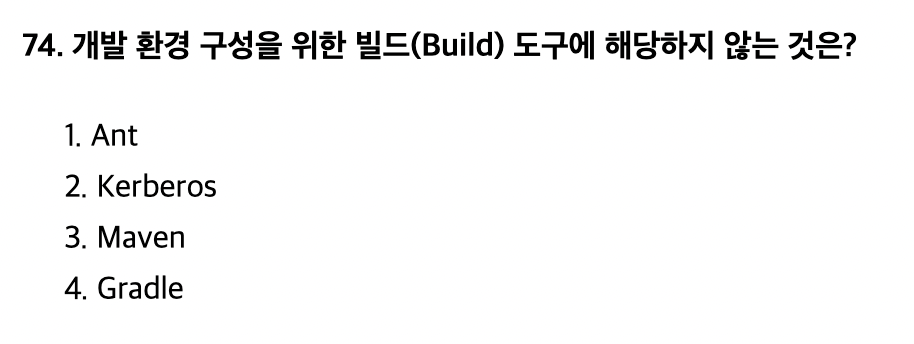 <문제 해설> Build = 작성된 Source Code를 실제 기기에서 실행 할 수 있는 소프트웨어로 변환하기 위한 과정 1) Ant = 아파치 재단에서 개발한 자바의 공식적인 빌드 도구 2) Kerberos = 컴퓨터 네트워크 인증 암호화 프로토콜로 3) Maven = 아파치 재단에서 개발, Ant 대안으로 개발되었음 4) Gradle = Ant, Maven 의 보완으로 개발된 빌드 도구(안드로이드 스튜디오 주 빌드 도구) [해설작성자 : 단기합격은 유튜브 윤파고] |