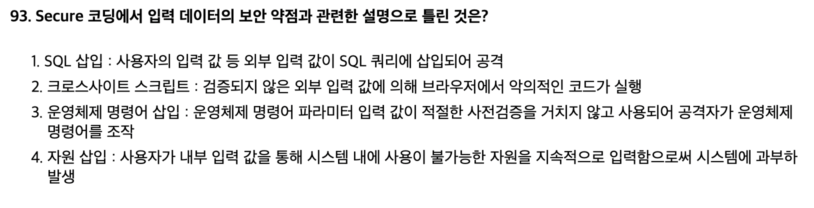 <문제 해설> 자원 삽입 : 자원을 조작 할 수 있는 문자열을 삽입하여 시스템이 보호하는 자원에 임의로 접근 할 수 있는 취약점 [해설작성자 : 정처기 공부] |