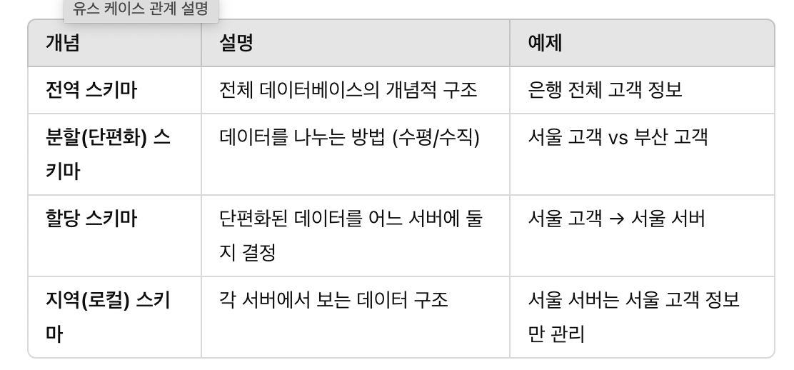 분산 데이터베이스의 구조 - 전역, 분할(단편화), 할당, 지역 스키마