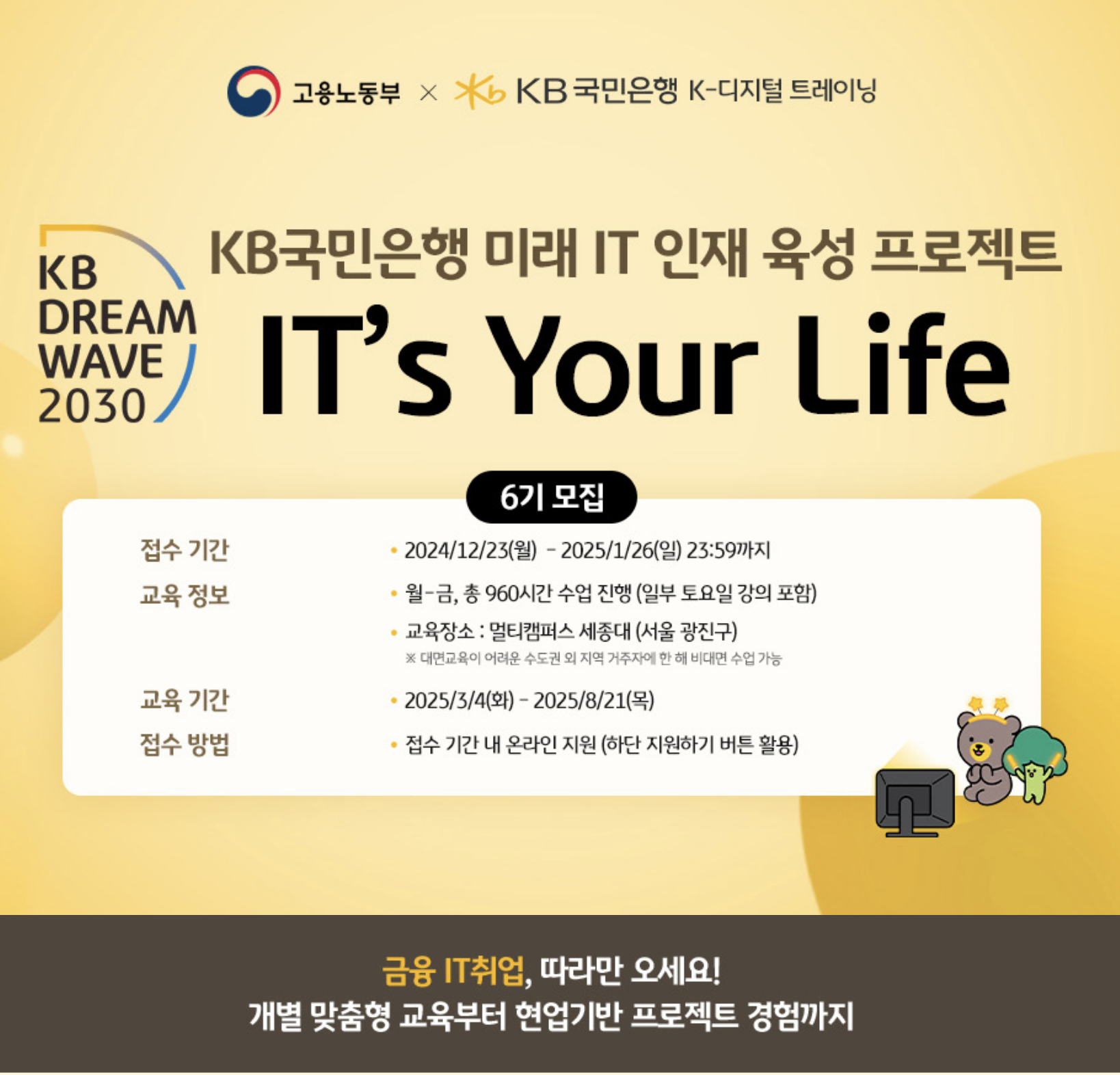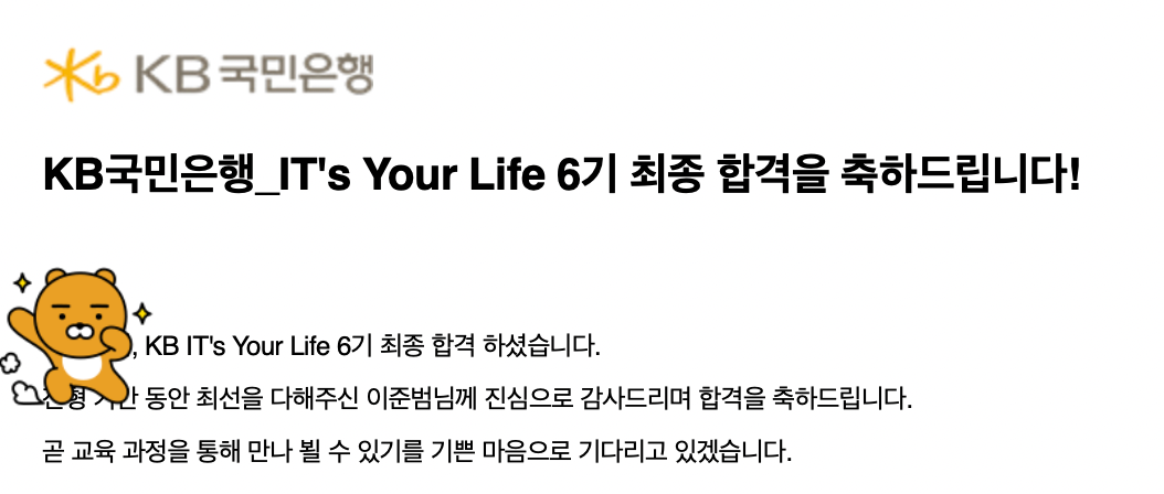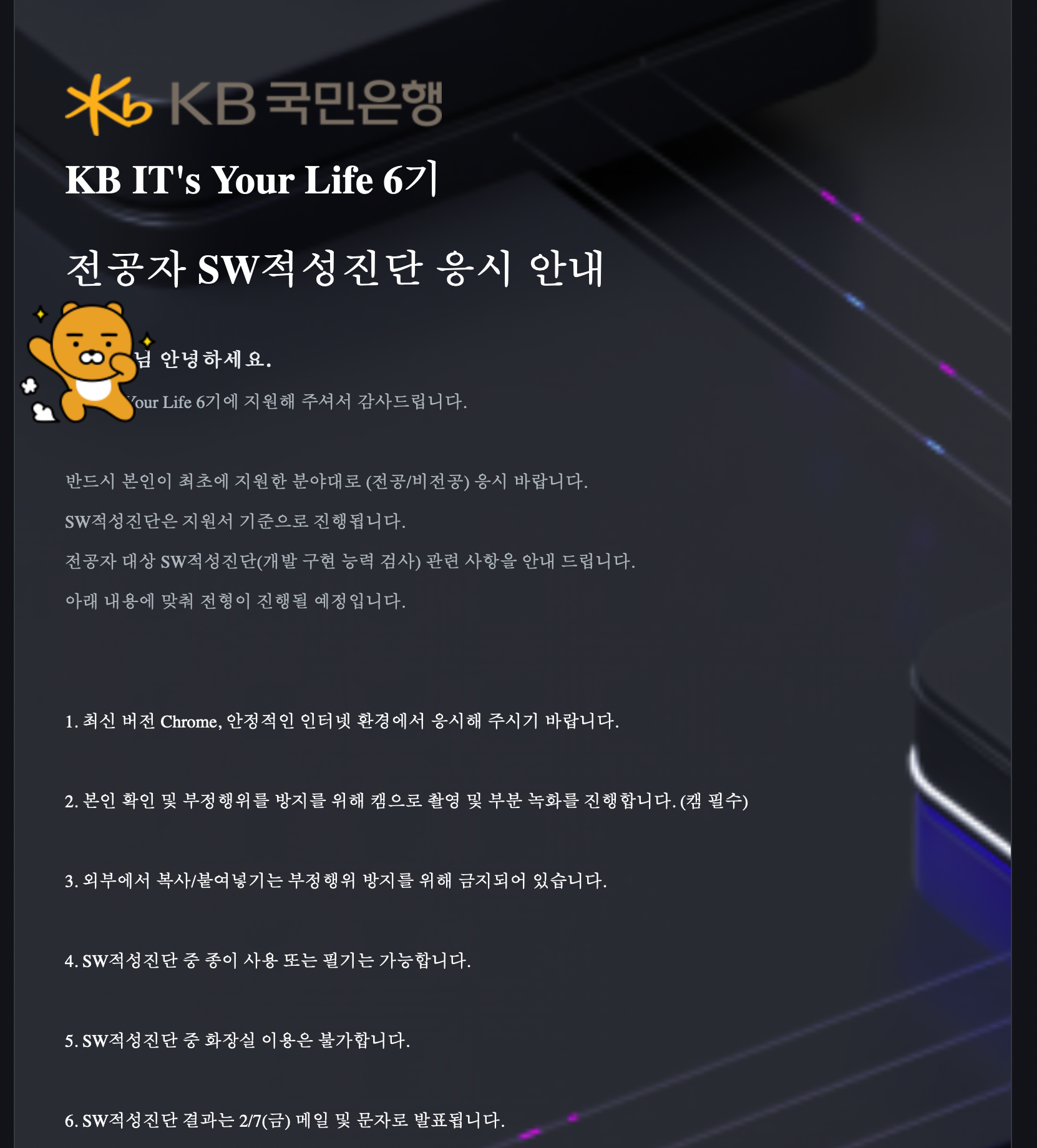 금융권 IT 취업을 목표로 하고 있어 국민은행 KB it's your life 부트캠프에 지원하게 되었고 6기 전공자 대면반에 합격했다.