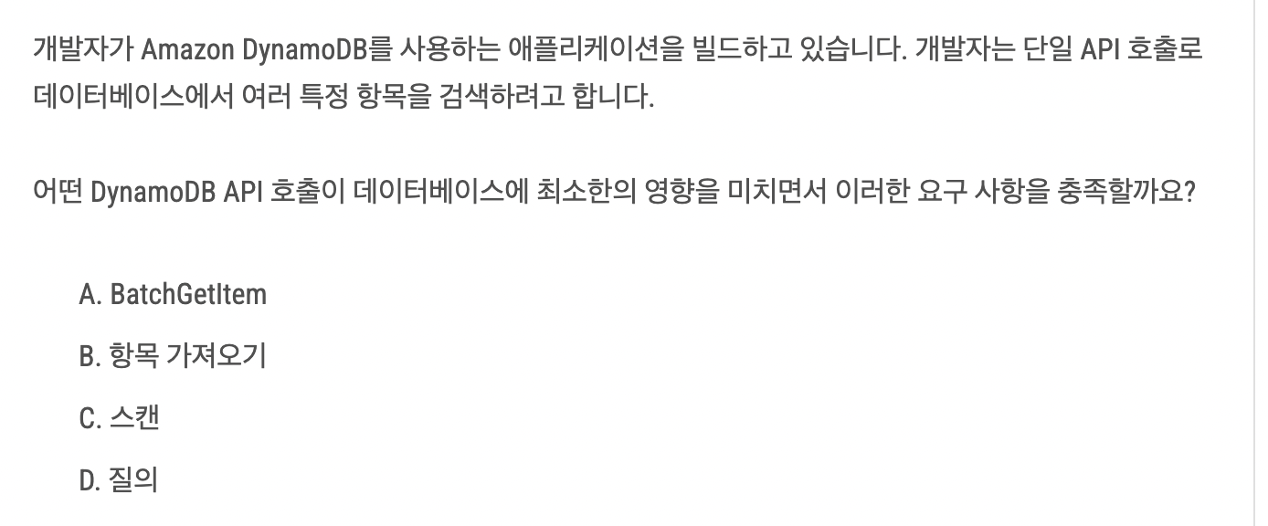 A는 여러 파티션 키를 기반으로 최대 100개의 항목을 한 번에 가져올 수 있으므로 A가 정답이다.