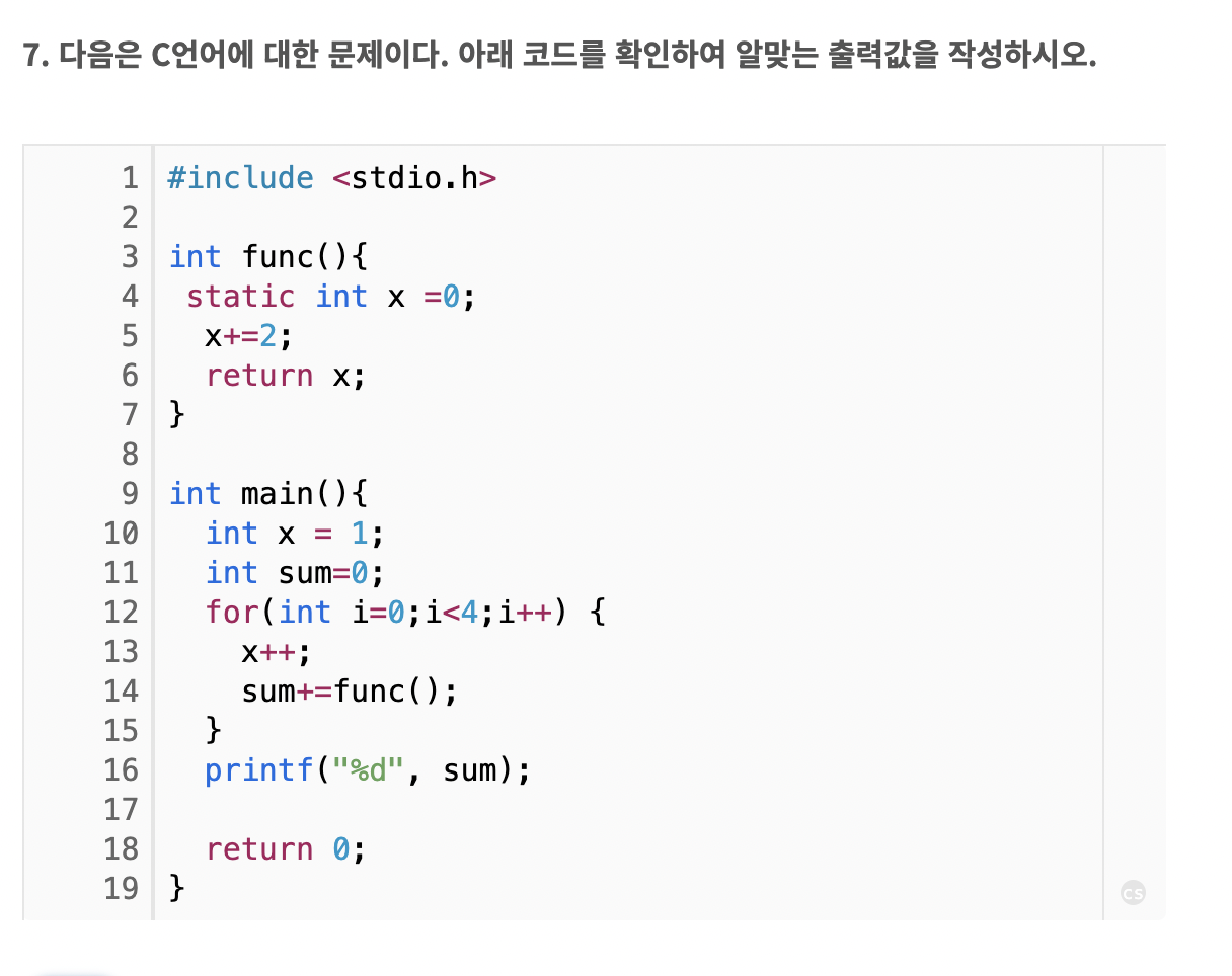 18. 다음은 C언어에 대한 문제이다. 아래 코드를 확인하여 알맞는 출력 값을 작성하시오.