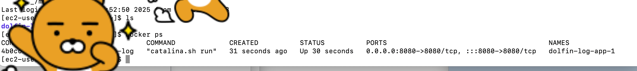 혹시 모르니 다시 ec2 접속해서 docker ps로 잘 돌아가나 확인해봅시다.