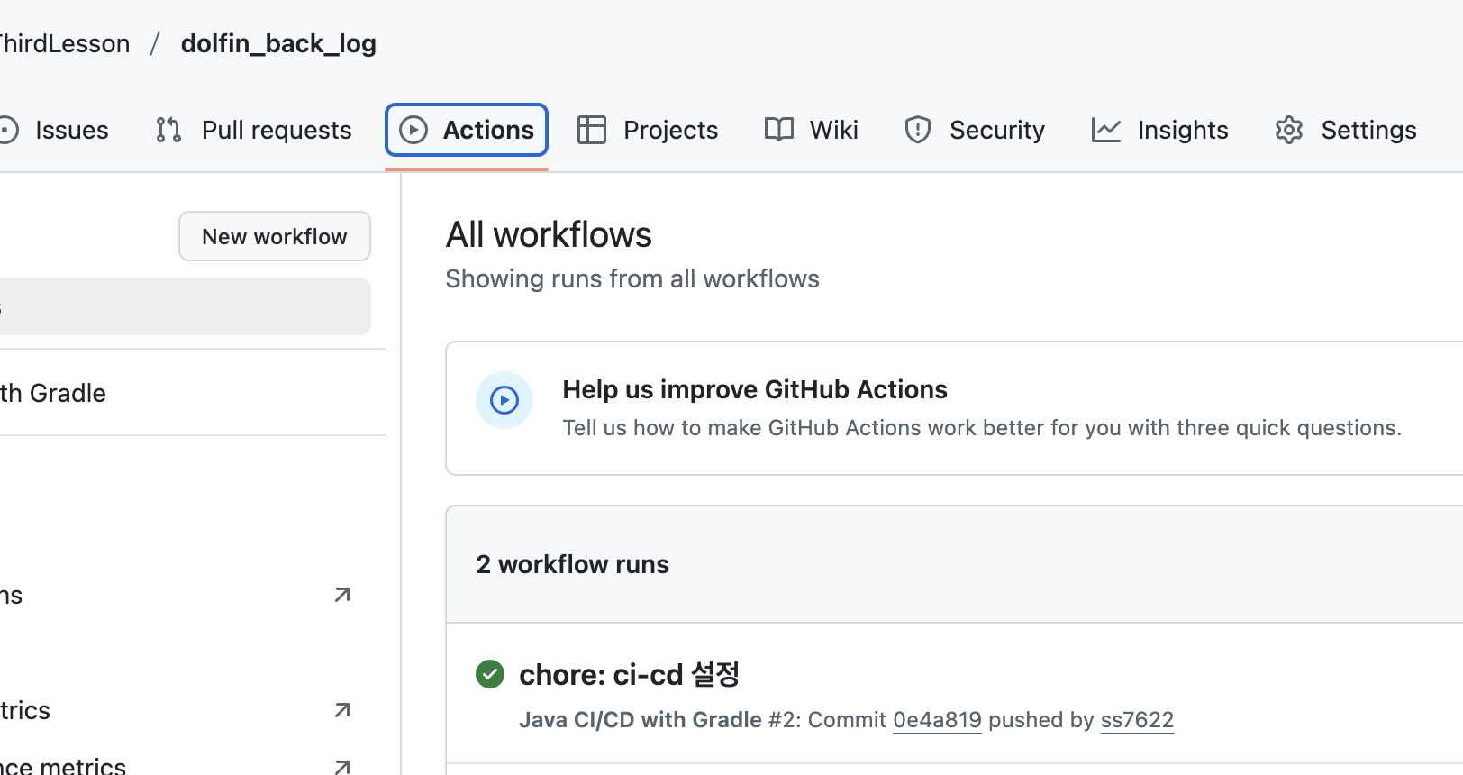 새로 생성된 gradlew, gradle 뭐 4개 파일 다시 깃 레포에 푸시해줬구요 결과를 살펴봅시다.