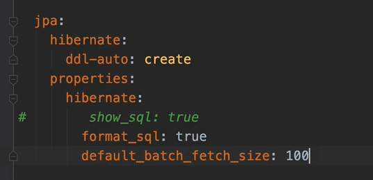 - 해당 옵션을 사용하면 컬렉션이나, 프록시 객체를 한꺼번에 설정한 size 만큼 in 쿼리로 조회한다.