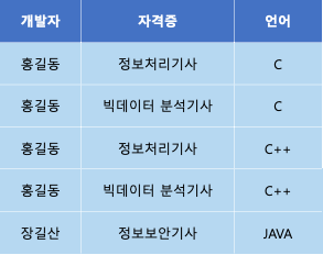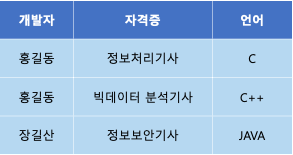 위의 테이블은 개발자가 자격증을 결정하고, 동시에 언어도 결정한다.