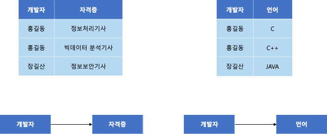 이와 같은 경우 다치 종속을 만족하므로, 다치 종속을 없애기 위해 다음과 같이 테이블을 분리할 수 있다.
