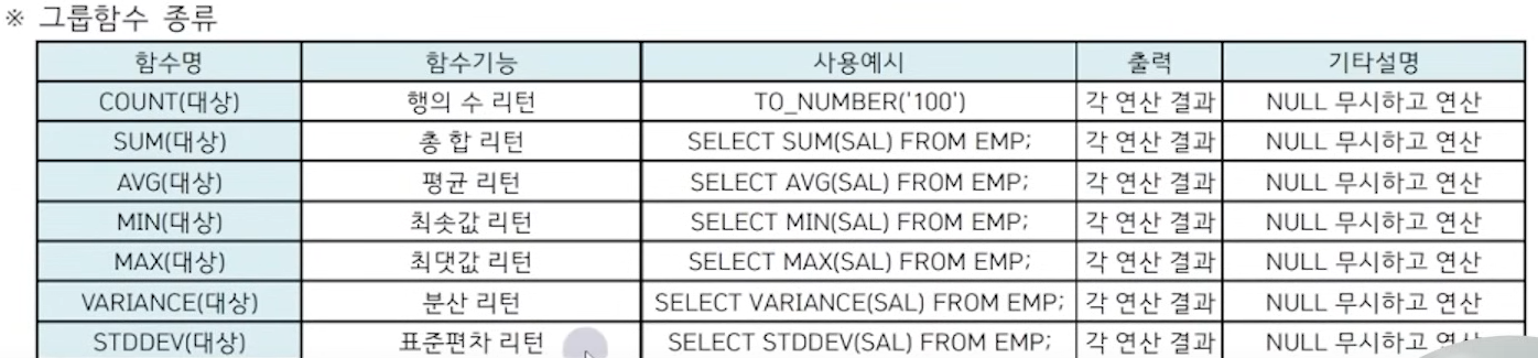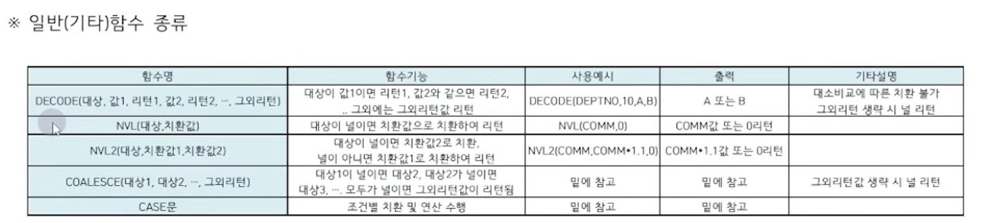 - 그룹 함수를 제외한 나머지 함수를 일반 함수라고 한다. (널 치환 함수 등등,,)