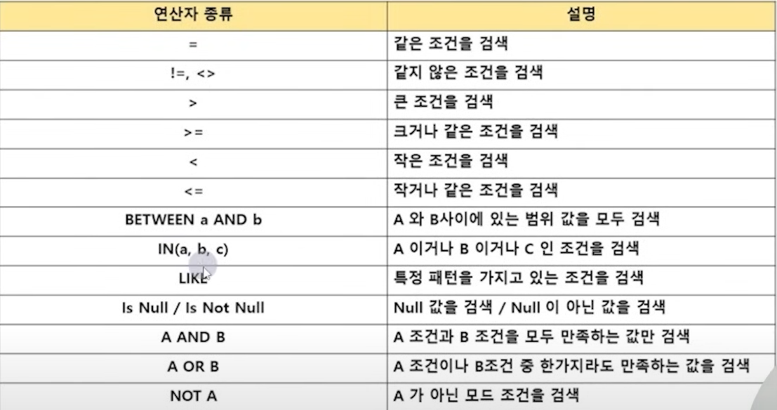 - NULL 조회 시 IS NULL / IS NOT NULL 연산자를 사용해야 된다. (a = NULL 불가능)