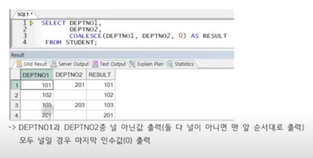 DEPTNO1과 2중 널이 아닌 값을 출력하며, 둘 다 널이 아니면 맨 앞 순서를 출력한다.