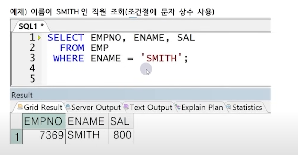 만약 오른쪽 왼쪽 순서를 맞추지 않는다면 아무것도 출력되지 않는다. - 문자나 날짜 상수 표현 시 반드시 홑따옴표 (') 를 사용해야한다. (다른 절에서도 동일함),