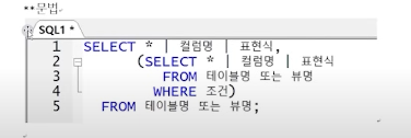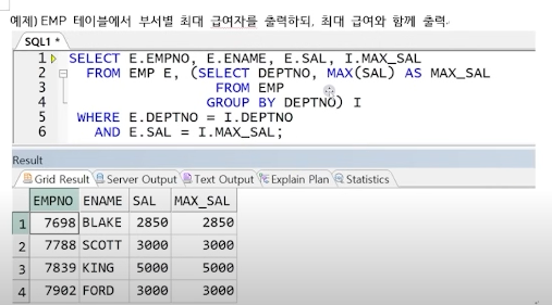 - where 절 서브쿼리와 다르게 서브쿼리 결과를 메인 쿼리에서 사용 가능하다.