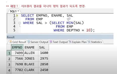 - 서브쿼리 연산자를 하나로 요약하거나 다중 행 서브쿼리 연산자를 사용해야 한다.