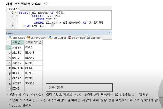 - 스칼라 서브쿼리를 사용한 조인 처리 시 outer join이 기본이다.