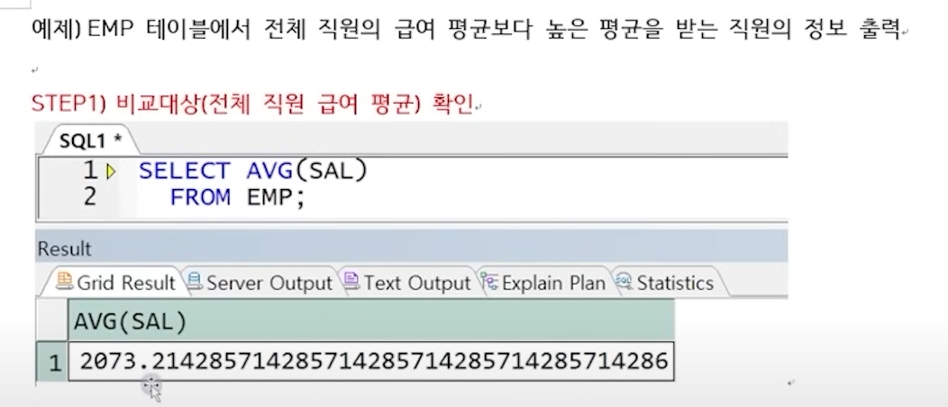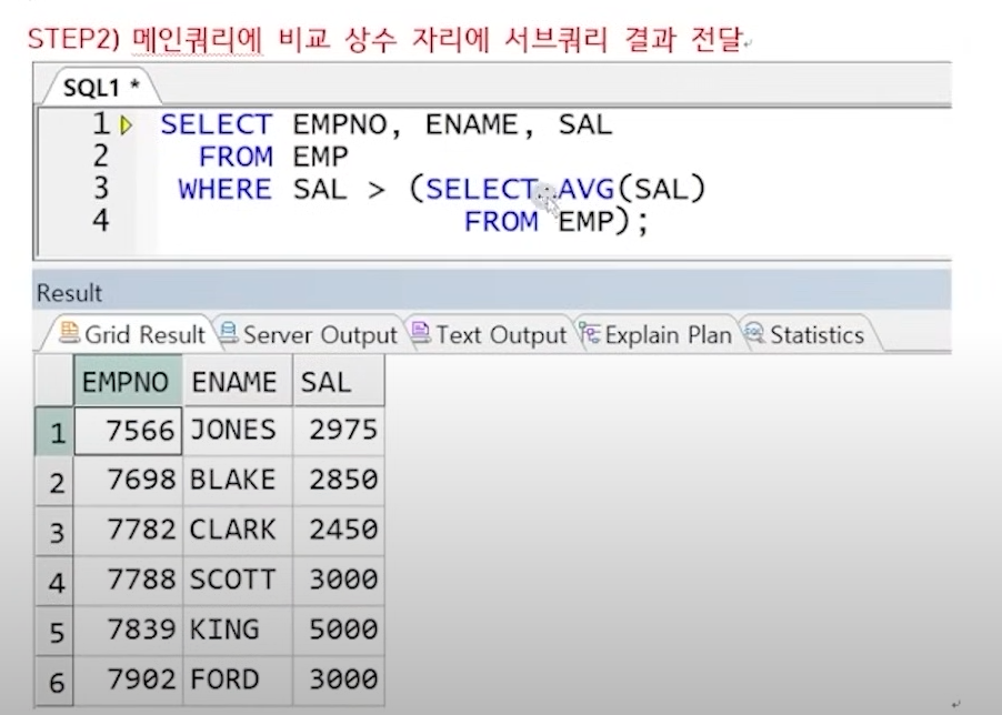 - 서브쿼리 결과가 1개의 행이 리턴되는 형태