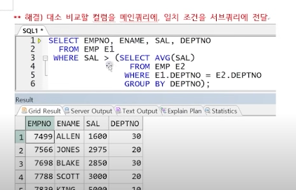 - 메인쿼리와 서브쿼리의 비교를 수행하는 형태다.