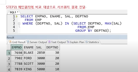 - 서브쿼리 결과가 여러 컬럼이 리턴되는 형태