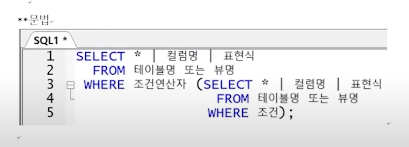 - 하나의 SQL 문 안에 포함되어 있는 또 다른 SQL 문을 말한다.