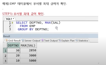 여기서 MAX(SAL)은 그룹함수다 즉 where절에서 사용이 불가능 하므로, 별칭을 만든 후 사용해야 한다.
