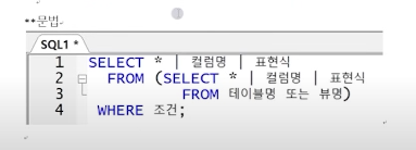 - where 절 서브쿼리와 다르게 서브쿼리 결과를 메인 쿼리에서 사용 가능하다.