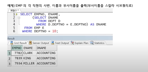 - 서브쿼리 결과를 마치 하나의 컬럼처럼 사용하기 위해 주로 사용한다.